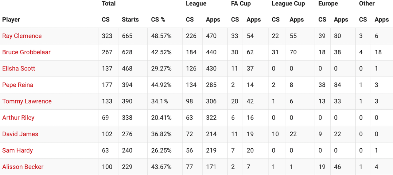 Alisson avancerar även på listan över Liverpools bästa målvakter genom tiderna. Med sina 100 nollor på 229 matcher är han bara två bakom David James (276 matcher), 33 till Tommy Lawrence och 37 till Elisha Scott. Till Ray Clemence (323 på 665 matcher), Bruce Grobbelaar (267 på 628) och Pepe Reina (177 på 394) är det dock fortfarande en bra bit.