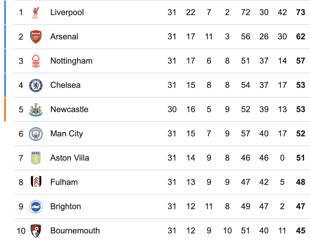 Mellan dem finner vi Forest och Chelsea, medan Aston Villa (51 poäng), Fulham (48), Brighton (47) och Bournemouth (45) fortfarande har en möjlighet att nå Champions League till hösten.
