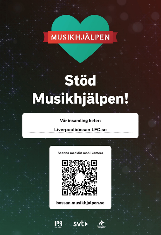 Supporterklubben ställer sig som alltid bakom Musikhjälpens initiativ – och uppmanar alla Liverpoolfans från Kiruna till Smygehuk att bidra i den grad de kan för att hjälpa till med insamlingen. Alla slantar räknas, skänk om du kan!
