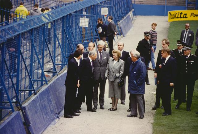 * Premiärminister Thatcher pratar med ansvariga poliser och tjänstemän efter katastrofen.