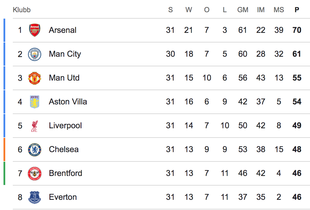 Arne Slots manskap hoppas såklart kunna titta uppåt snarare än neråt i tabellen och på fjärdeplatsen återfinns Aston Villa, som har fem poäng mer än The Reds. Trea är Manchester United som har en poäng mer än Villa.